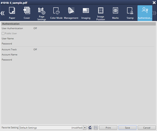 Sur l'écran Authentication du pilote Plug-in PS, vous devez entrer les informations concernant le réglage de l'authentification utilisateur ou compte département ou bien les deux. Toutefois, dans AccurioPro Print Manager, les informations de configuration s'affichent automatiquement, sans qu'il soit nécessaire de les saisir. Pour en savoir plus sur les éléments de réglage, voir Ecran [Authent.].