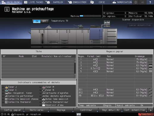 Explication supplémentaireSi vous appuyez sur l'onglet COPIE à l'écran pendant le préchauffage, l'écran COPIE s'affiche. Lorsque le message Disponible pour tâche suivante apparaît sur l'écran COPIE, vous pouvez définir les tâches en impression et numériser les originaux pendant le préchauffage de la machine pour permettre le démarrage de l'impression sans délai à la fin du préchauffage. Pour des détails, voirRéserve de tâches de copie pendant la mise en température.