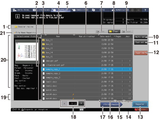 10 | Multi sél. | Appuyez dessus avant de sélectionner dans la liste plusieurs tâches enregistrées sur le disque dur. Appuyez dessus, puis sélectionnez les tâches en appuyant dessus dans la liste. Appuyez à nouveau sur Multi sél. pour annuler cette fonction. Vous ne pouvez pas sélectionner les dossiers ou boîtes utilisateur affiché(s). |