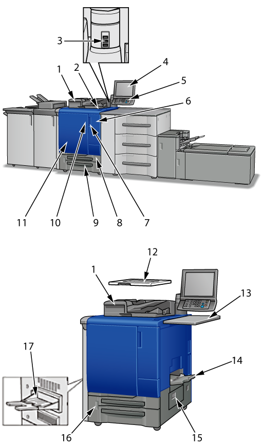 14 | Passe-copie multi-feuilles MB-506 (en option) | S'ouvre pour utiliser du papier différent de celui chargé dans les bacs machine. Chargement de 250 feuilles(80 g/m2 / 21 lb Bond) max. |