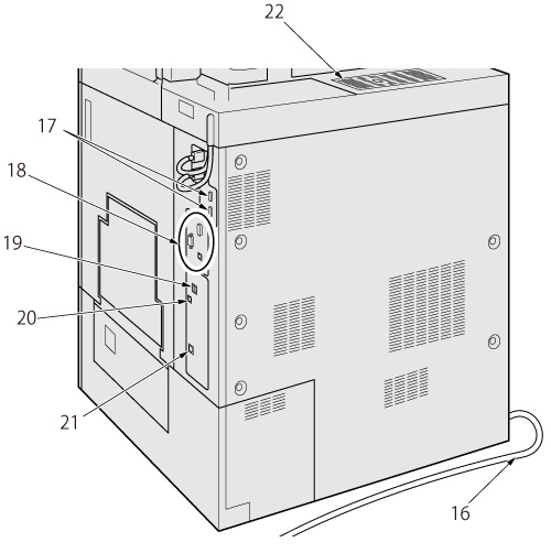21 | Port réseau (10Base-T, 100Base-TX, 1000Base-T) | Reçoit un câble Ethernet pour utiliser la machine, ou se servir de la machine comme imprimante/scanner réseau. |