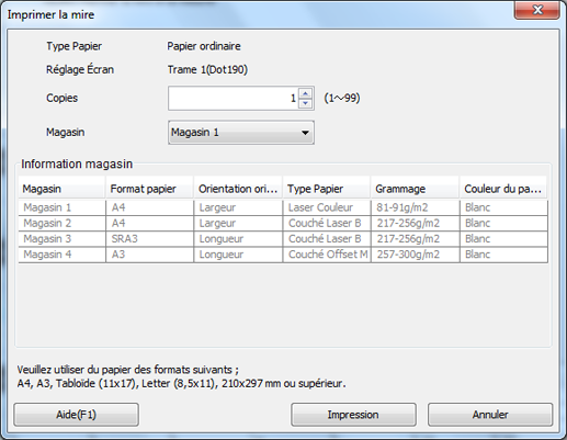 L'impression de la mire est exécutée. L'écran Mesure de la précision de l'étalonnage réapparaît à la fin de l'impression.