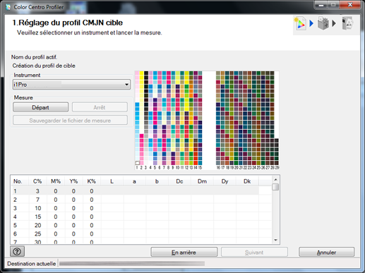 Sélectionnez un colorimètre dans Instrument sur l'écran de mesure des mires.