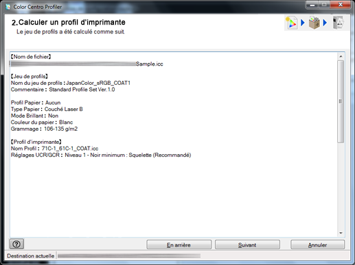 Explication supplémentaireSi vous avez créé ou modifié un jeu de profils avec Color Centro Profiler, l'écran Assistant (écran Détermination des profils) apparaît, respectivement.