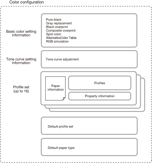Vous pouvez créer, modifier et gérer des configurations de couleur et des jeux de profils. Pour effectuer ces opérations, utilisez Color Centro Profiler. Color Centro Profiler est un logiciel utilitaire fourni avec Color Centro.