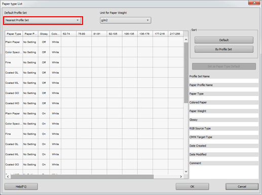 Pour définir un jeu de profils comme type de papier par défaut, sélectionnez le jeu de profils et cliquez sur Définir comme type de papier par défaut.