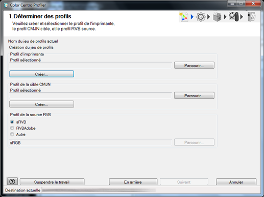 Sur l'écran Détermination des profils, spécifiez le Profil d'imprimante, le Profil de la Cible CMJN et le Profil de la Source RVB utilisés par le jeu de profils. Vous pouvez aussi créer le Profil d'imprimante et le Profil de la Cible CMJN.