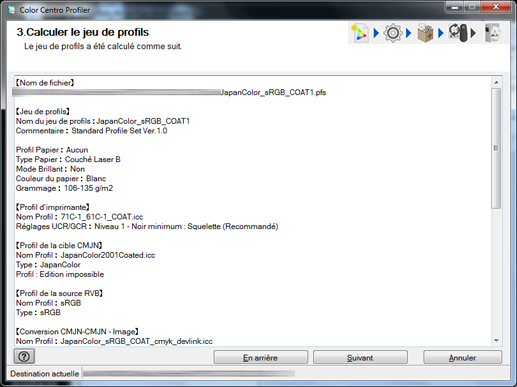 Saisir un nom de jeu de profils et un commentaire. Dans le champ Commentaire, entrez, si besoin est, un commentaire à intégrer au jeu de profils que vous créez. Vous pouvez confirmer le commentaire en sélectionnant le jeu de profils sur Color Centro Profiler.
