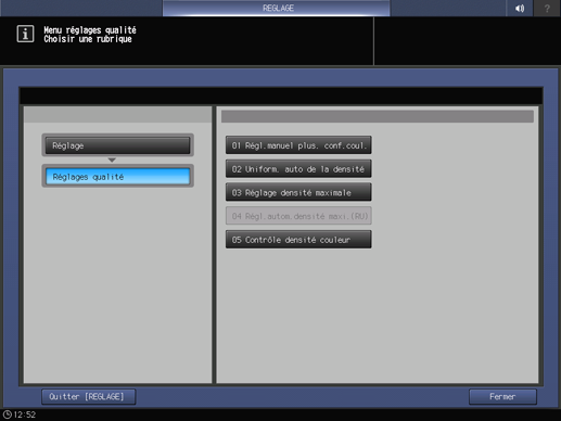 Sur l'écran tactile de la UNITÉ PRINC., appuyez sur RÉGLAGE sur l'écran UNITÉ PRINC., puis appuyez sur Contrôle densité couleur dans Réglages qualité sur l'écran Menu réglages.