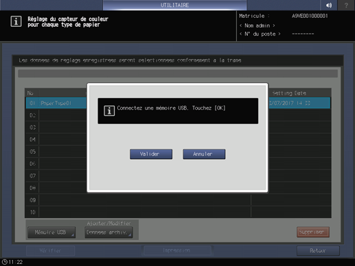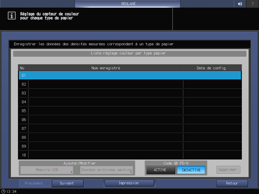 Vous pouvez enregistrer sur la machine les données de mesure (valeur de densité couleur pour chaque type de papier) sauvegardées dans la mémoire USB ou sur l'ordinateur réseau.