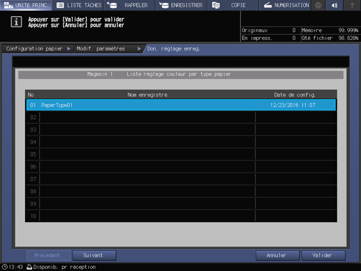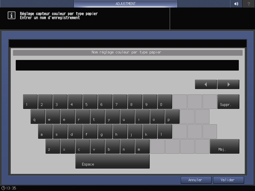 Entrez le nom enregistré du contrôle couleur pour chaque type de papier et appuyez sur Valider.