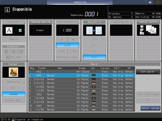 Explication supplémentairePour définir le bac de sortie, appuyez sur Réglage sortie en haut à droite de l'écran IMPRESSION.