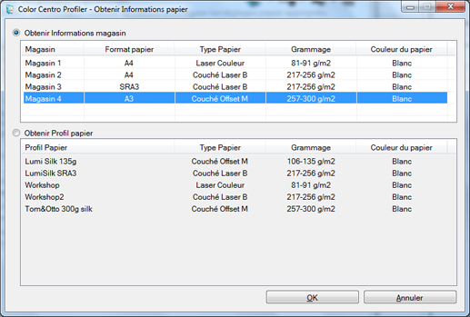 Exemple : cliquez sur Obtenir Informations Profil Magasin / Papier pour utiliser le réglage papier du magasin 3 (Couché Laser B : (A3) 128 g/m2 / 33 lb Bond).