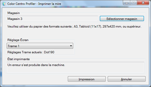 Sur l'écran Imprimer la mire, définissez Magasin et Réglage Ecran. Après le réglage, cliquez sur Impression.