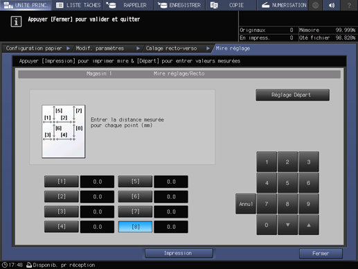 14. Réimprimez la mire de réglage du recto et vérifiez les longueurs aux points [2], [4], [6] et [8] de la seconde et troisième mires de test.