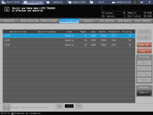 Vous pouvez modifier l'ordre des tâches en impression ou annuler des tâches réservées sur l'écran LISTE TÂCHES. Pour des détails, voirÉcran [LISTE TÂCHES].