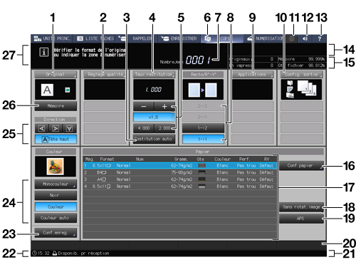 15 | Indicateur Gestion machine | Affiche le nombre d'impression d'originaux et le nombre de tâches en cours (unité : nombre), ainsi que la quantité restante de mémoire et du système de fichiers (unité : %). |