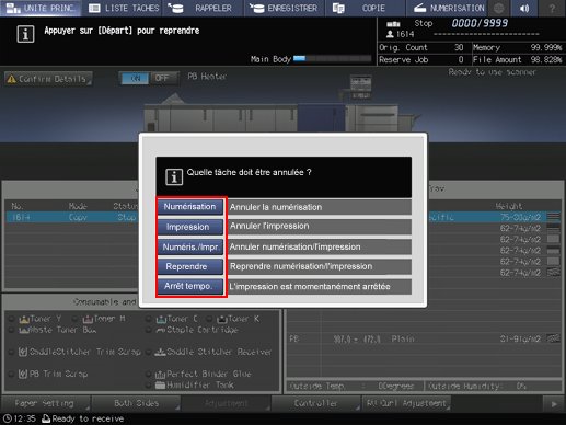 Explication supplémentaireAppuyez sur Impression pour arrêter la tâche d'impression et poursuivre la tâche de numérisation.