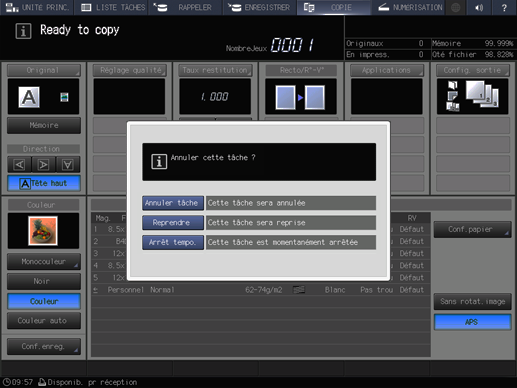Explication supplémentaireAppuyez sur Arrêt tempo. pour suspendre la tâche. Quand la tâche est suspendue, certains réglages peuvent être modifiés. Appuyez sur Départ sur le panneau de commande pour reprendre la tâche.