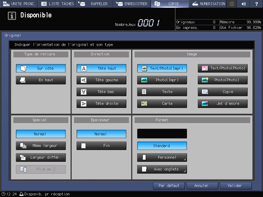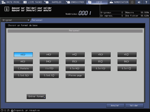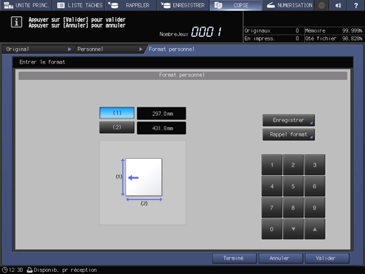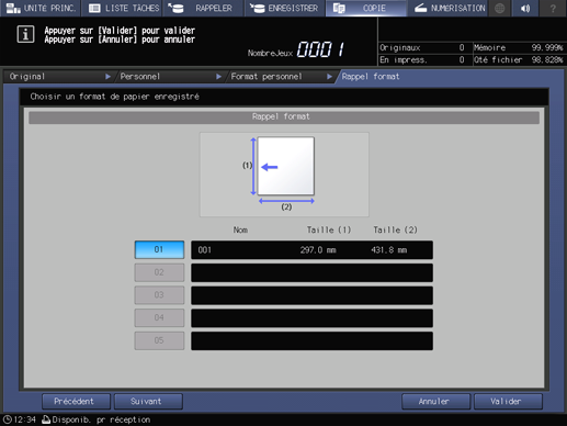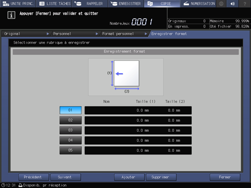 condition préalableVous pouvez enregistrer des formats personnalisés. Les informations de formats enregistrés peuvent être utilisés ultérieurement dans les réglages de format papier original et copie.