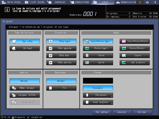 Appuyez sur l'onglet COPIE pour afficher l'écran COPIE.