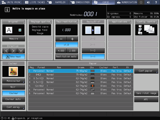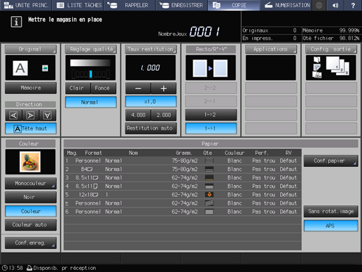Un maximum de 4 raccourcis des éléments de réglage fréquemment utilisés peuvent être affichés sous Réglage qualité sur l'écran COPIE. Ces touches vous permettent de passer directement sur l'écran de réglage correspondant. Vous pouvez effectuer le réglage des touches de raccourci dans le Réglage utilisateur du menu Utilitaires.