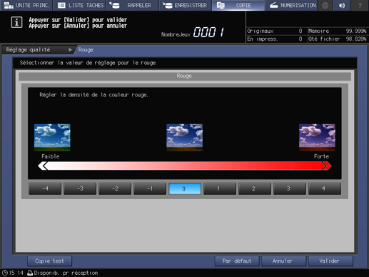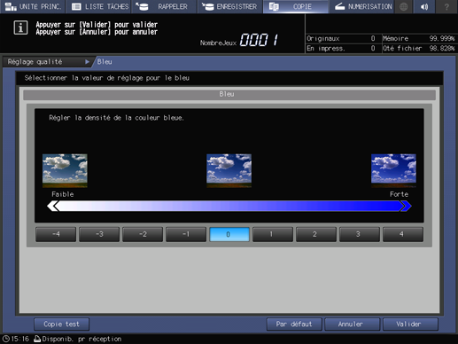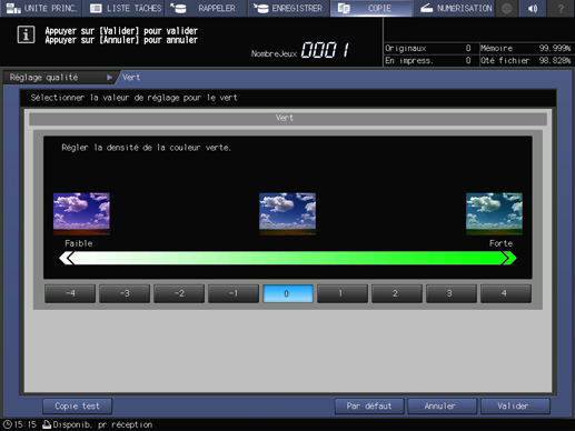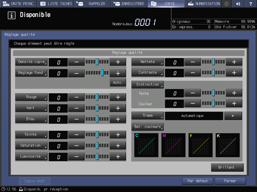 L'écran COPIE réapparaît. L'indication de la couleur modifiée se trouve sous l'onglet Réglage qualité de l'écran COPIE.