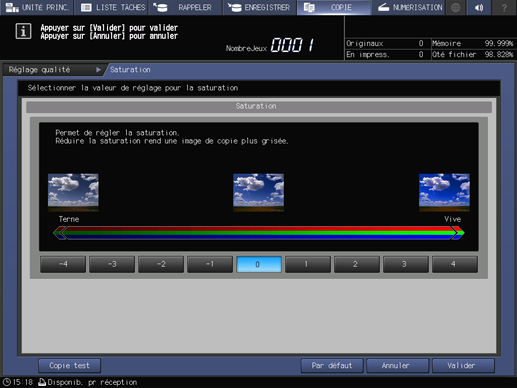 L'écran COPIE réapparaît. L'indication Saturation se trouve sous l'onglet Réglage qualité de l'écran COPIE.