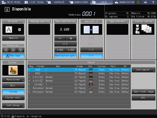 condition préalableRestitution auto est incompatible avec Sélect.auto.papier mais Rotation image est disponible.