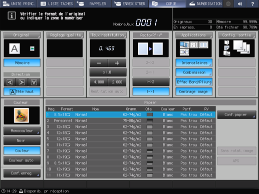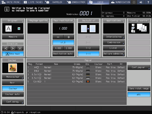 Un maximum de 4 raccourcis des éléments de réglage fréquemment utilisés peuvent être affichés sous l'onglet Applications de l'écran COPIE. Ces touches permettent de définir la fonction application en un clic ou de passer directement à l'écran de réglage correspondant. Vous pouvez effectuer le réglage des touches de raccourci dans le Réglage utilisateur du menu UTILITAIRE.