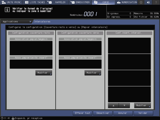 condition préalableJusqu'à 100 types d'intercalaire peuvent être spécifiés dans une plage comprise entre 1 et 999 pages séparément des couvertures recto et verso. De même, vous pouvez insérer un maximum de 40 feuilles à chaque point d'insertion de l'unité d'insertion.