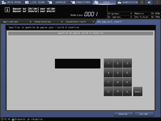 Réglage d'insertion | Les couvertures de l'unité d'insertion peuvent être jointes à 40 feuilles max. Appuyez sur Nombre pour spécifier le nombre sur le clavier à l'écran et appuyez sur OK. |