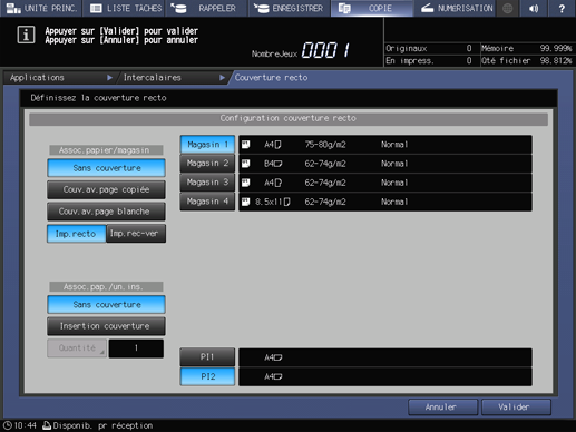 Explication supplémentaireLe papier couverture peut provenir simultanément d'un magasin papier et du magasin de l'unité d'insertion. Dans ce cas, l'unité d'insertion alimente la première couverture (recto) et la dernière couverture (verso).