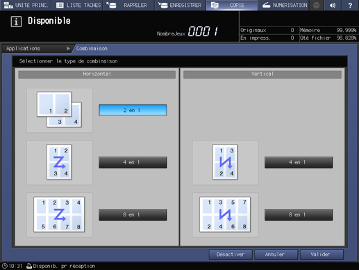Utilisez cette fonction pour disposer et copier un nombre fixe (2, 4 ou 8) de pages sur une même feuille de papier de façon à réduire la consommation de papier. Les options suivantes sont proposées dans Combinaison. La position de départ de combinaison dépend de la configuration de Direction.