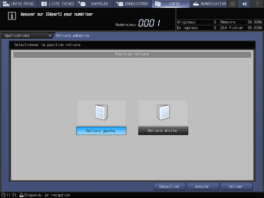 Explication supplémentairePour annuler la fonction Reliure adhésive et enregistrer le réglage actuel, appuyez sur Désactiver.