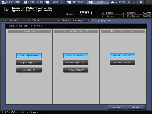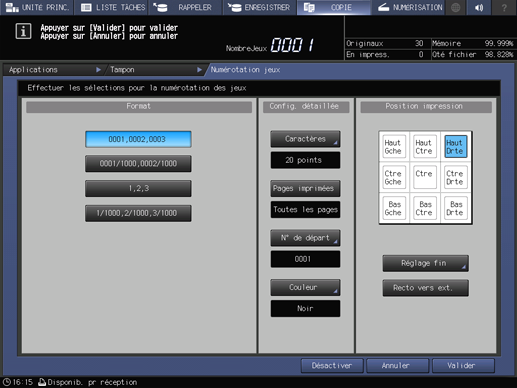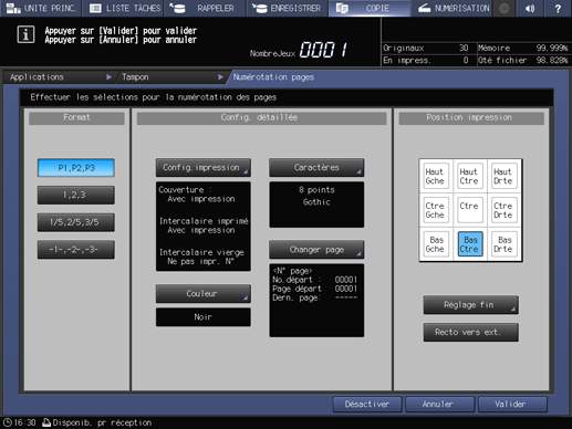 Pour la numérotation, définissez les paramètres Format, Conf. détaillée (Modif.taille texte, Pages imprimées, N° de départ et Couleur) et Position impression.