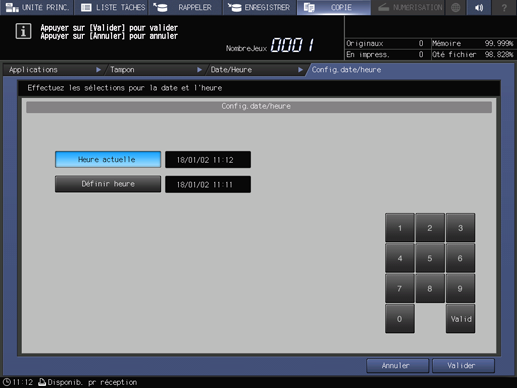 Conf.date/heure | Modifiez la date et l'heure à imprimer de l'heure actuelle prédéfinie sur la machine à l'heure voulue. |