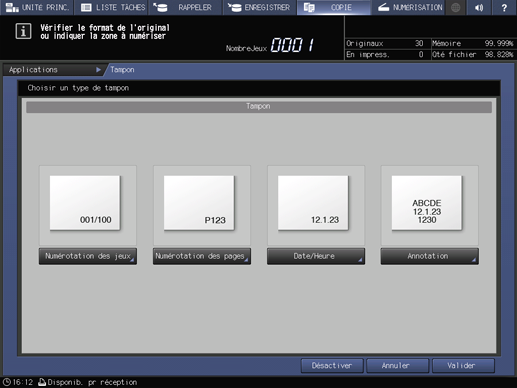 Imprime les informations non fournies dans l'original (Numérotation, Numérotation pages et Date/heure) sur une copie.