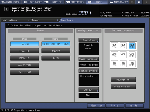 Pour la date et l'heure, définissez Format, Config. détaillée (Caractères, Pages imprimées, Config.date/heure et Couleur) et Position impression.