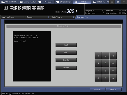 Effectuez les réglages fins de la position d'impression de Numérotation jeux, Numérotation des pages, Date/Heure et Annotation. Réglage fin est disponible sur l'écran de chaque fonction. Une pression sur Réglage fin affiche l'écran suivant. La plage de réglage est comprise entre 0 et 1,96 pouces (0 à 50 mm), dans le sens de la longueur (Haut ou Bas) et dans le sens de la largeur (Droite ou Gauche).