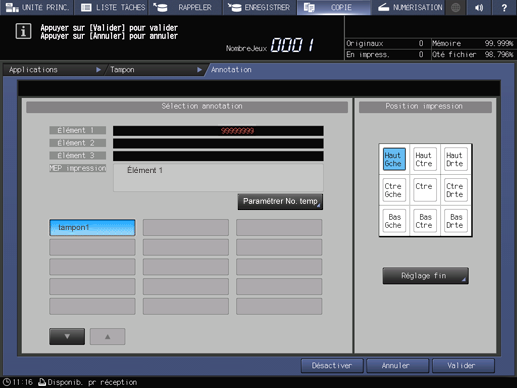 Cette fonction vous permet de rappeler une combinaison de texte, date/heure de chargement de l'original et numéro d'annotation de l'original et de les imprimer sur les copies imprimées à l'endroit désigné. Vous pouvez modifier temporairement le numéro d'annotation sur l'écran Annotation après le rappel du réglage prédéfini (Paramétrer No. temp).