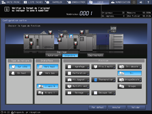 Explication supplémentaireLes jeux pliés et agrafés (et massicotés) sont éjectés dans le bac de réception de la piqueuse à cheval. Si le bac n'est pas entièrement tiré, la machine détecte que le bac est plein, même si le nombre de jeux de finition est inférieur au nombre spécifié.
