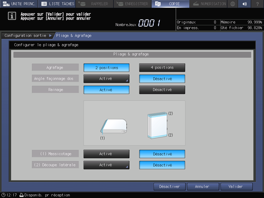 Explication supplémentaireLorsque Pli.&agraf. est sélectionné à l'étape 5, sélectionnez 2 positions ou 4 positions dans Agrafage, puis sélectionnez Activé ou Désactivé dans (1) Massicotage.