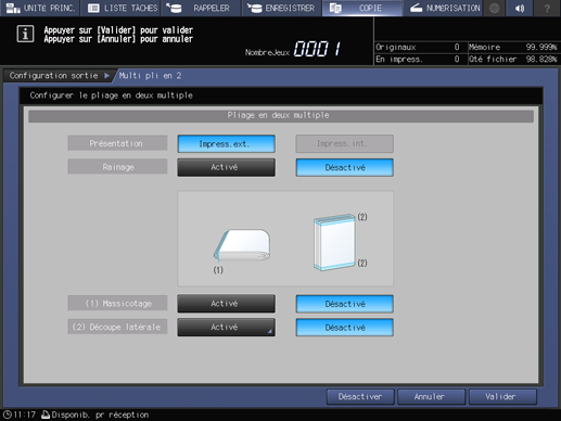 Explication supplémentaireLorsque Multi pli en 2 est sélectionné à l'étape 5, sélectionnez Activé ou Désactivé pour (1) Massicotage.