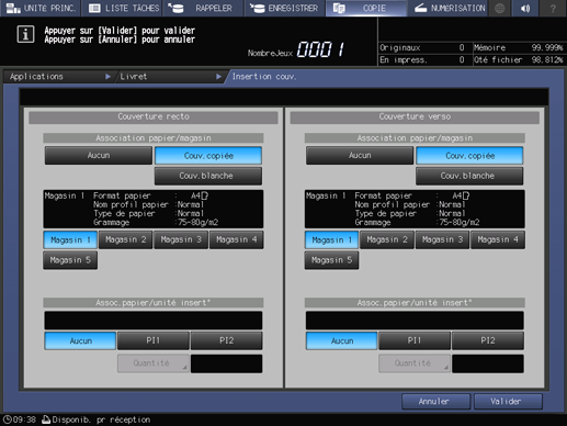 Explication supplémentaireLorsque vous sélectionnez un magasin papier, sélectionnez d'abord Couv.copiée ou Couv.blanche.
