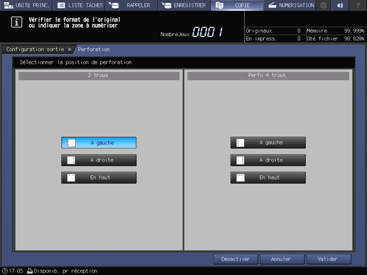 5. Appuyez sur la touche souhaitée pour sélectionner le type et la position des trous perforés.