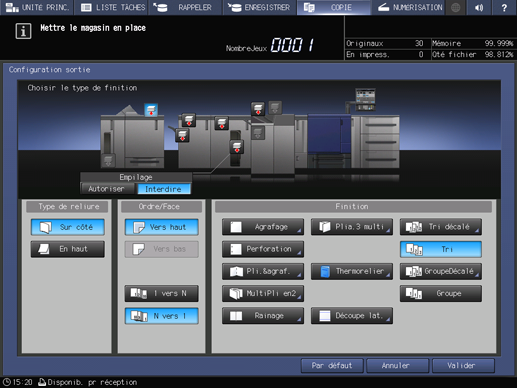 Explication supplémentaireLe bac de sortie est indiqué sur l'image de face de la machine représentée sur l'écran Config. sortie. Si le bac de l'empileur n'est pas sélectionné comme bac de sortie, appuyez sur le bouton de la position du bac de l'empileur .