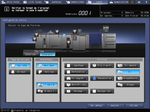 Appuyez sur Autoriser si vous autorisez l'empilage de plusieurs tâches dans le plateau d'empilage ou appuyez sur Interdire dans le cas contraire, puis cliquez sur Valider.