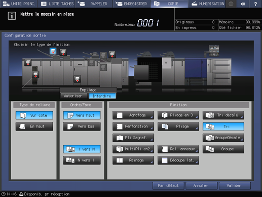 Le réglage initial d'une machine dotée de l'unité de finition FS-532 prévoit la sortie des jeux triés dans le bac principal, indépendamment de l'installation d'autres options.