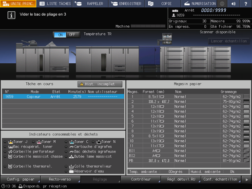 Si la capacité du bac de pliage est dépassée, la machine s'arrête automatiquement d'imprimer.